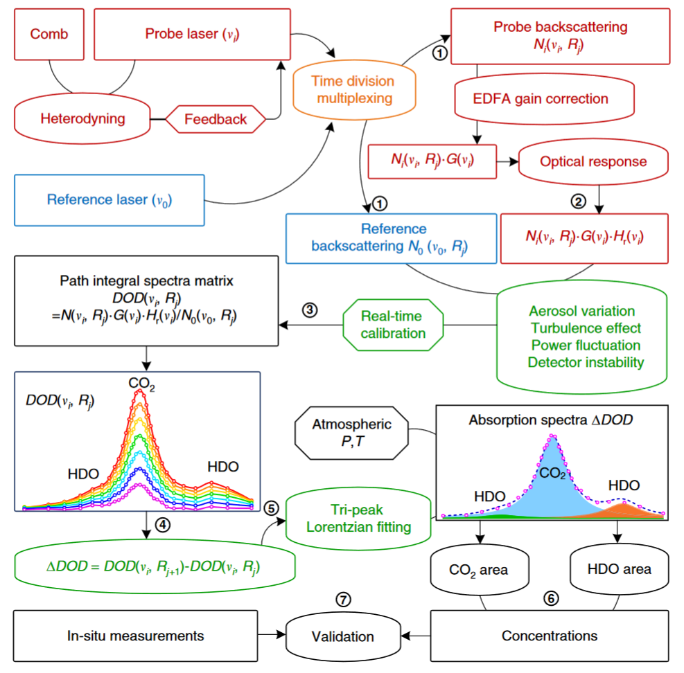 Fig. 3. Backscattering signals and spectra. a The probe signal, with 30 scanning frequencies, covers CO2 and HDO absorption lines. b The reference signal without gas absorption. c The total optical depth spectra of CO2 and HDO at different ranges. d Lorentzian fitting of the range-resolved spectra; magenta dots are the measured ΔDOD values at 4 km with ΔR = 60 m.