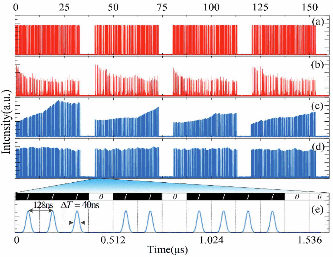 Fig. 2. Laser pulse sequence. (a) Golay coding seed laser and (b) amplified laser sequence without feedback control; (c) Golay coding seed laser; (d) amplified laser sequence with feedback control; (e) enlarged waveform of (d).