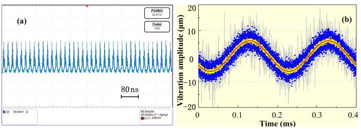 Fig. 5. (a) Picture of the temporal interferograms recorded on the OSC (Tektronix Model TDS7704B, 7 GHz bandwidth, 20 Gs/s sampling speed). (b) Vibration measurement results. Single-shot measurements based on the new data processing method (blue dots). Averaged results (yellow dots). Sine fit result (red line). Single-shot measurements based on the FFT algorithm (light gray region).